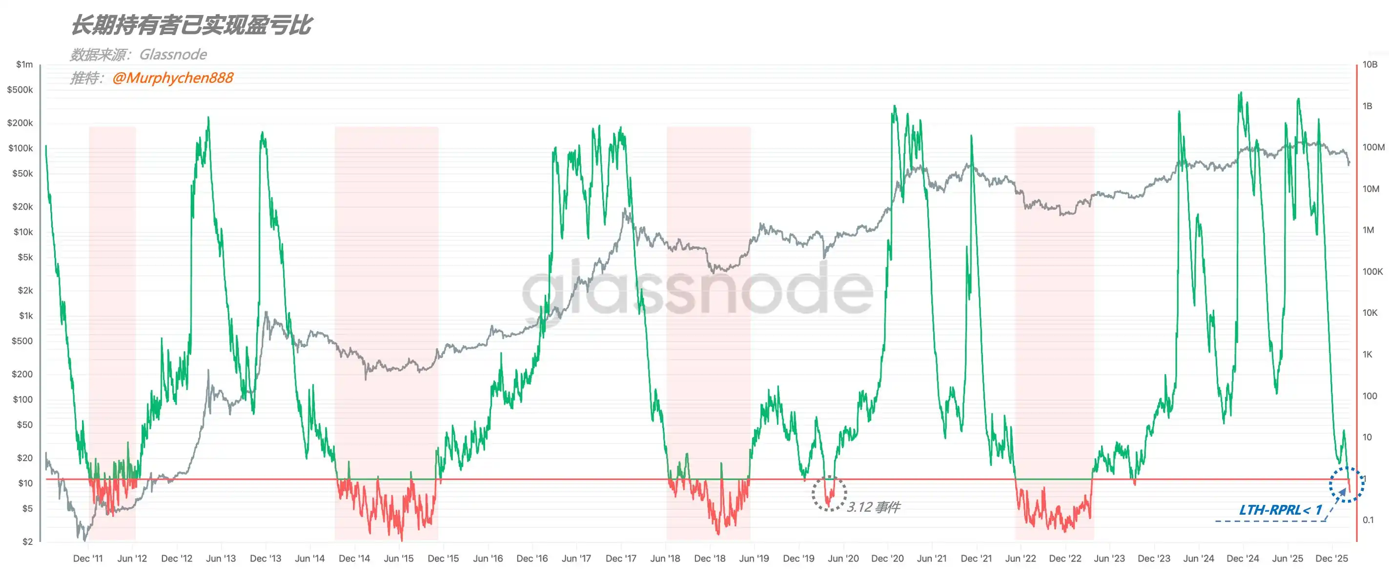 Murphy stated that the current market sentiment is extremely fragile, with the typical market sentiment being “ignoring good news and amplifying bad news.” During this phase, it is more likely to see “an event exacerbating panic, causing LTH sentiment to collapse; this is also the final tremor of each bear market.” Looking back at history, when LTH-RPRL drops below 1, the probability of BTC entering a deep bear mode afterward becomes very high. Note that the term “deep bear” here does not refer to a steep decline but rather a long duration of the bear market.