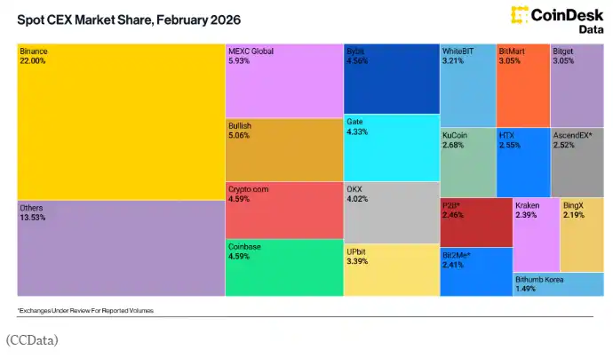 BlockBeats News, March 12, according to CoinDesk Data, the institutional-focused crypto exchange Bullish saw a 62.6% increase in its February spot trading volume to around $76 billion, increasing its market share to 5.06%, surpassing Coinbase’s 4.59%. Meanwhile, overall trading activity on centralized exchanges slowed down, with spot and derivative trading volume decreasing by 2.41% to around $5.61 trillion, with spot trading volume accounting for around $1.50 trillion.