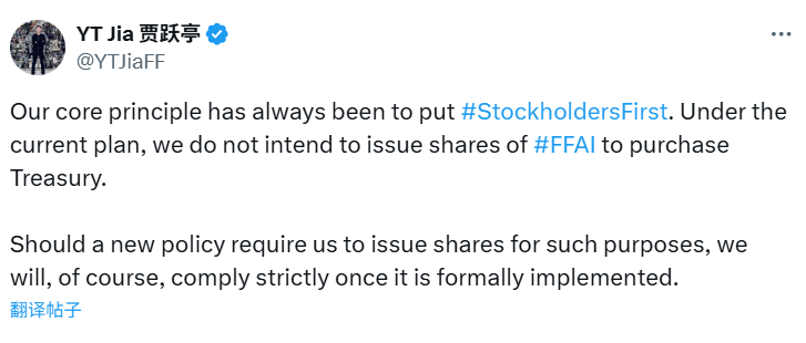 BlockBeats News, September 5th, Jia Yueting tweeted that the core principle of Faraday Future (FFAI) has always been “shareholder first.” The company has no intention to issue FFAI shares for treasury holdings. If a new policy requires the issuance of shares for this purpose, the company will strictly comply after formal implementation.