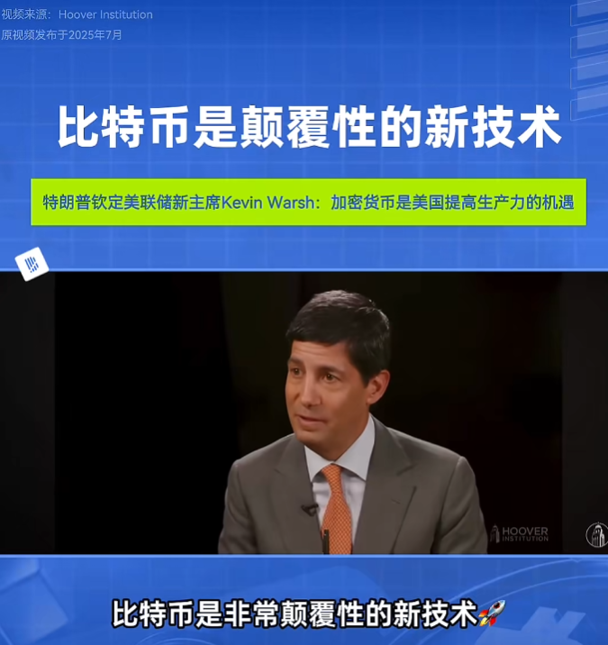 BlockBeats News, January 30th, Kevin Warsh, nominated to be the next Federal Reserve chairman by Trump, said in an interview in 2025 that Bitcoin is a very disruptive new technology, it is an important asset, and it is even a “physical exam report” for decision-makers. “Whether we are right or wrong, you can tell by its price, so it is more like the inspector of monetary policy.”