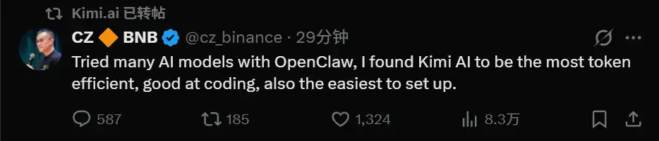 Today, CZ said, “I have tested many AI models with OpenClaw and found that Kimi AI’s Token is the most efficient, has good encoding performance, and is also the simplest to configure.”