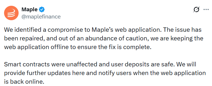 BlockBeats News, on February 9, Maple announced that its Web application had a security vulnerability. The issue has been fixed, but as a precaution, we will temporarily shut down the Web application to ensure that the fix is complete.