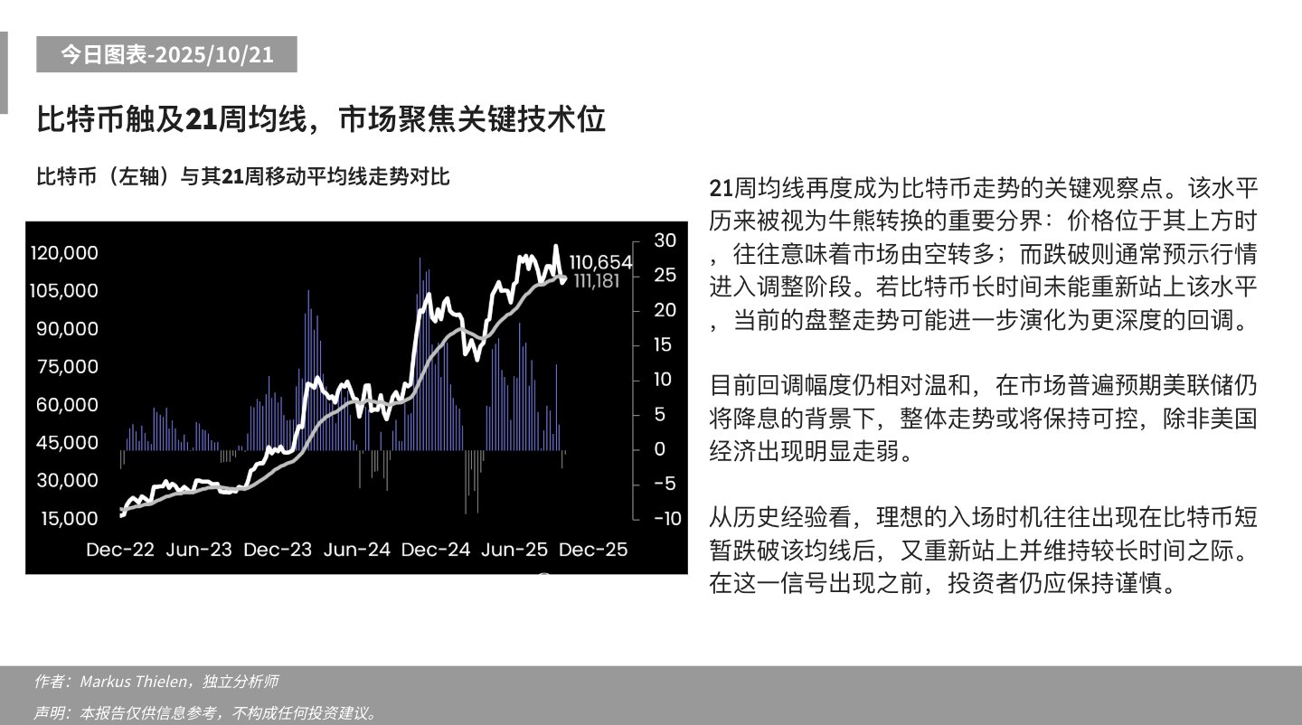 BlockBeats News, October 21st, Matrixport shared the following market insights: The 21-week moving average has once again become a key observation point for Bitcoin’s trend. This level has always been seen as an important dividing line for bull-bear conversion: when the price is above it, it often means the market is shifting from bearish to bullish; whereas a drop below it usually indicates the start of a market correction. If Bitcoin fails to reclaim this level for a long time, the current consolidation trend may further evolve into a deeper pullback.