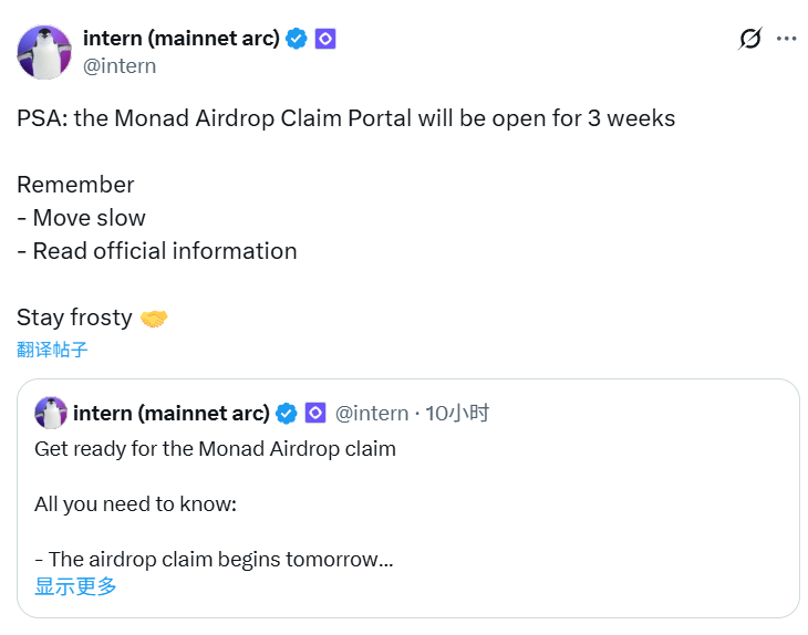 BlockBeats News, October 14th, Kevin McCordic, Growth Lead at Monad (@Intern), announced that the airdrop claiming portal will open tomorrow at 21:00 Beijing time and will remain open for 3 weeks.