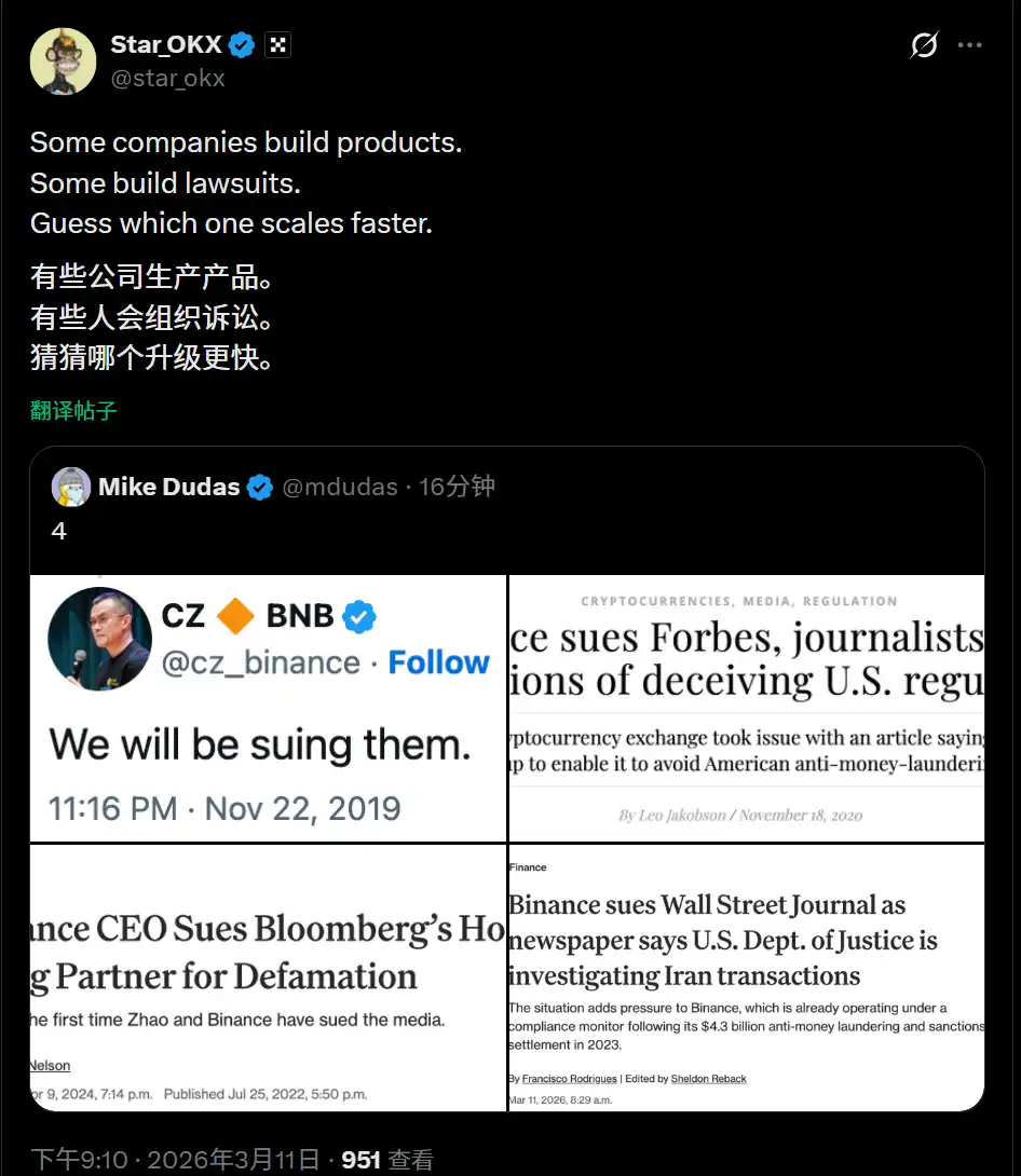 BlockBeats News, March 11, OKX founder and CEO Star retweeted the report “Binance Sues The Wall Street Journal for Defamation” and stated, “Some companies build products, some companies organize lawsuits, guess which one scales faster.”