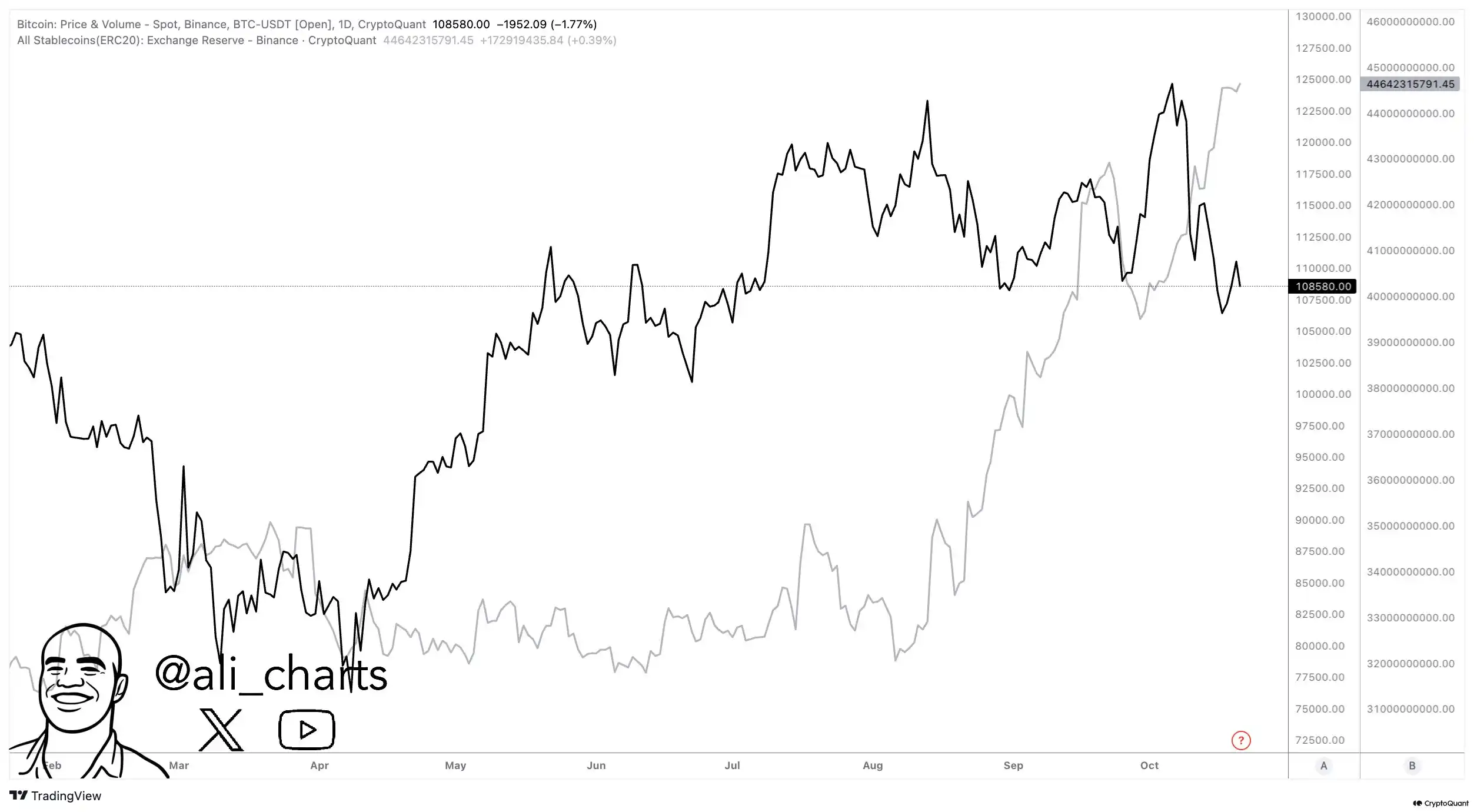 BlockBeats News, October 22, according to analyst @ali_charts, Binance’s stablecoin reserves have surged from $32 billion to $44.6 billion in just two months. This indicates that investors are shifting from cryptocurrency to stablecoins.