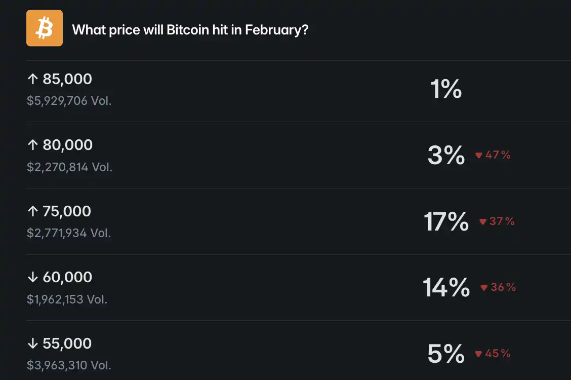 Polymarket Prediction: Probability of "Bitcoin Reaching $75K in February" Drops to 17%