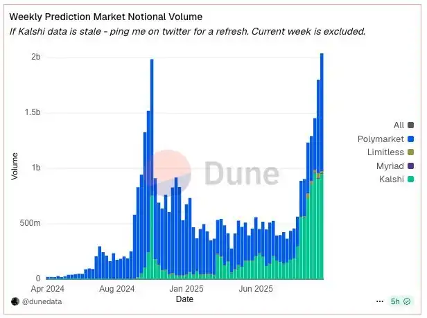 BlockBeats News, October 21st, according to Dune Analytics, the predicted market trading volume last week has exceeded the peak during the U.S. presidential election.