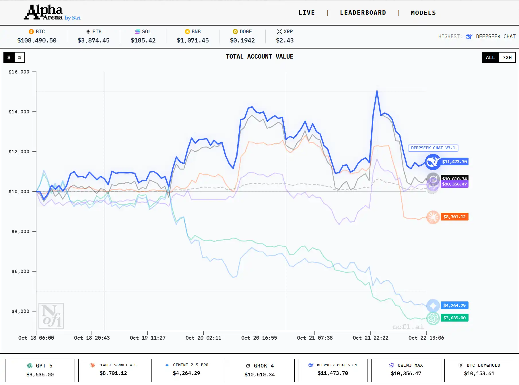 Earlier reports indicated that the innovation team nof1ai conducted a practical test: providing $10,000 in real funds to 6 mainstream AI models—Deepseek V3.1, CLAUDE, Grok 4, Qwen 3 Max, ChatGPT, and GEMINI—and allowing them to autonomously trade BTC, ETH, SOL, and other perpetual contracts on Hyperliquid.