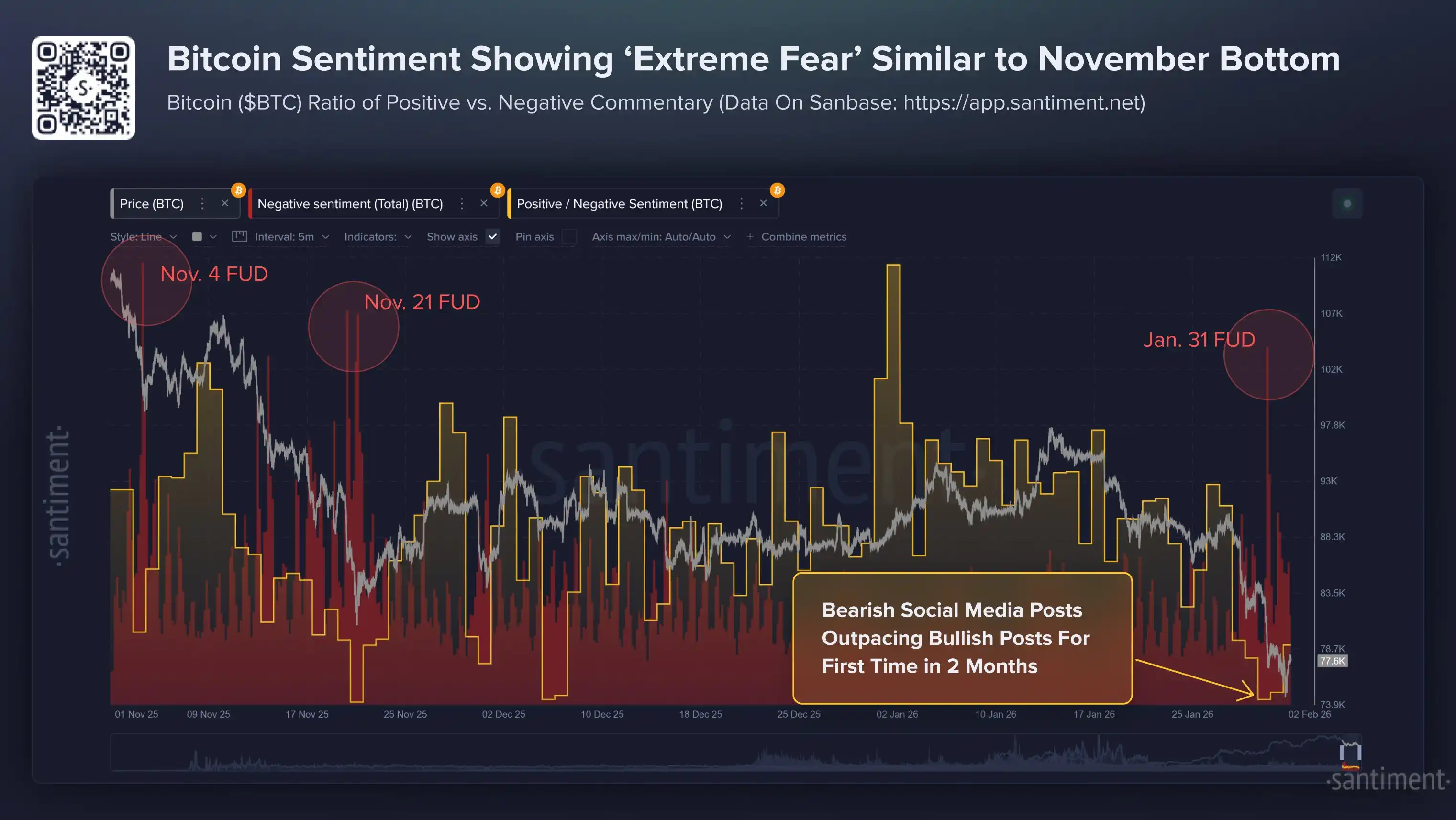 BlockBeats News, February 2nd, Cryptocurrency market research firm Santiment posted on social media today, stating that since January 28th, Bitcoin has dropped by 16%, with social media flooded with FUD (Fear, Uncertainty, Doubt) sentiment. After dropping to a low of $74,600, BTC has rebounded to $78,300 due to retail panic selling. This once again proves that market trends often go against popular narratives.