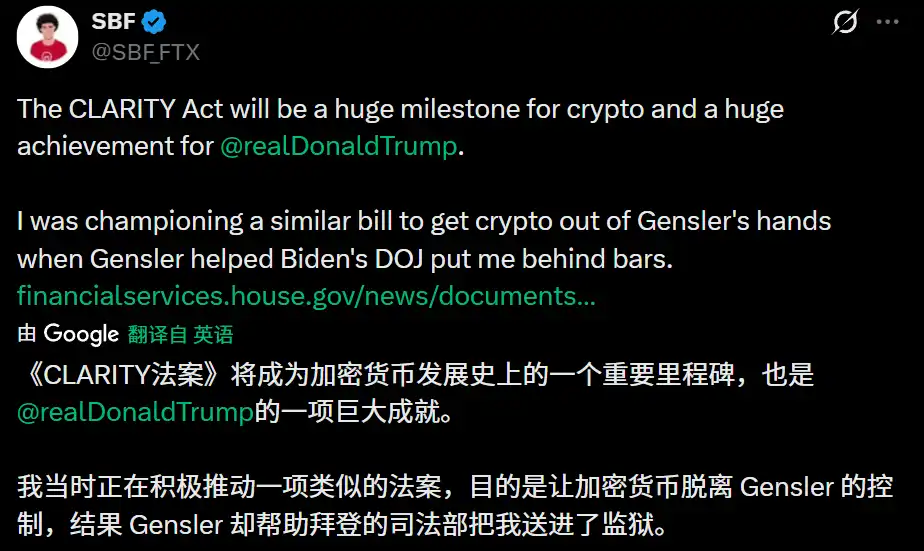 BlockBeats News, February 25th, FTX founder SBF posted a message mentioning President Trump, stating that the “Cryptocurrency Market Structure Act” (referred to as the CLARITY Act) will be a significant milestone in the history of cryptocurrency development and a major achievement for President Trump. “I once actively promoted a similar bill with the aim of freeing cryptocurrency from the control of former SEC Chair Gary Gensler, but Gensler ended up helping Biden’s Justice Department send me to prison.”