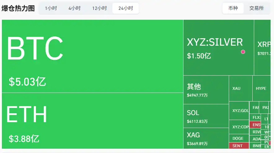 According to Coinglass data, liquidations across the network in the past 24 hours totaled $1.382 billion, with XYZ:SILVER (mainly on Hyperliquid for silver) liquidating $150 million, XAG liquidating $36.69 million. Silver trading has become the third largest asset in terms of liquidation amount in the crypto field, second only to Ethereum and Bitcoin. Silver, as a TradFi trading asset, has been launched on a large scale in the crypto field for less than a month.