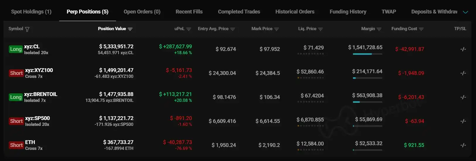 With the S&P 500 trading on Hyperliquid, Rune has taken a 20x leveraged short position on the S&P 500 (SP500) and simultaneously increased its 7x leveraged long position on Brent Crude Oil (BRENTOIL).