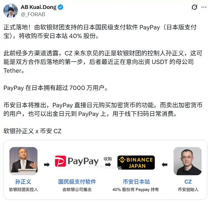 BlockBeats News, October 9th. Regarding the news that “Cashless payment service provider PayPay (backed by SoftBank) has reached a cooperation agreement, with the latter acquiring 40% of Binance’s Japan shares,” crypto KOL AB Kuai.Dong stated, “It was previously revealed through various channels that CZ came to Tokyo to meet with the controlling person of the SoftBank Group, Masayoshi Son. This may be the first step in the collaboration between the two parties, with the latter recently showing intentions to invest in Tether, the parent company of USDT.”