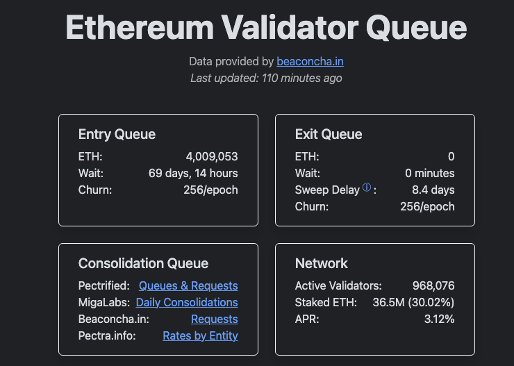 BlockBeats News, February 8th. According to the Validator Queue tracking website validatorqueue data, since December 26, 2025, the number of ETH queued to join the Ethereum PoS network has been continuously increasing, now standing at 4,009,053 ETH, worth approximately $8.455 billion, with an expected activation delay of about 69 days and 14 hours. This reflects a strong and sustained staking demand, mainly driven by Ethereum treasury companies and institutions such as BitMine staking a significant amount of ETH they hold.