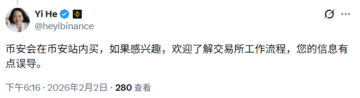 BlockBeats News, February 2nd, He Yi responded to community doubts that “Binance’s BTC purchase is only for internal fund management and did not receive BTC from an external address,” stating, “Binance will buy on Binance internally.”