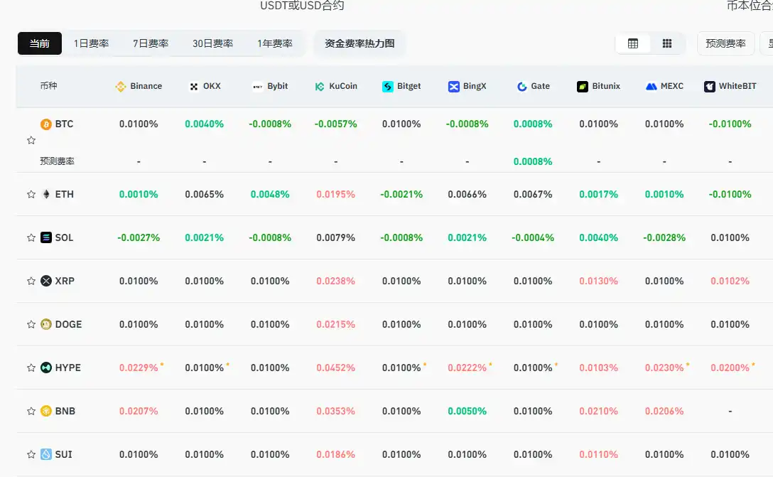 BlockBeats News, October 3rd, according to Coinglass data, after a strong rebound in the crypto market in the past 2 days, the current mainstream CEX and DEX funding rates show that the market is still in a neutral state and has not entered an overheated stage. The specific funding rates are shown in the following chart.