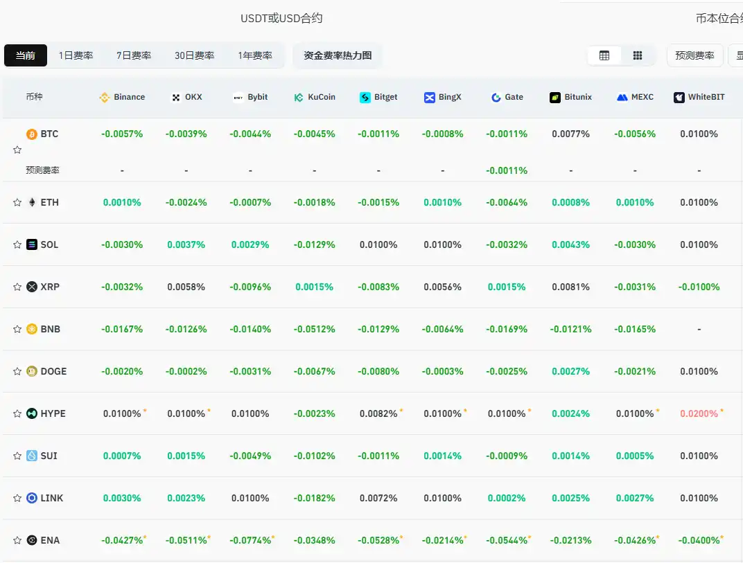 BlockBeats News, October 18th, according to Coinglass data, the current mainstream CEX and DEX funding rates show that after a further decline in the past two days, the current market has turned bearish across the board. The funding rates for major assets on various trading platforms’ perpetual contract trading pairs are almost all negative, as shown in the specific funding rates in the following chart.
