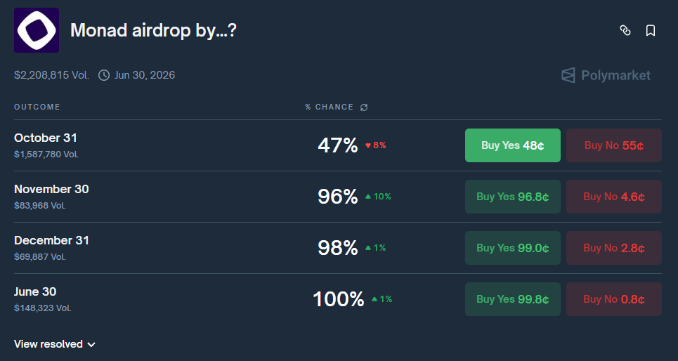 Home News The probability of airdrop distribution for Monad by the end of October on Polymarket has decreased to 47%, following earlier hints from the official Monad team suggesting an “imminent airdrop.”