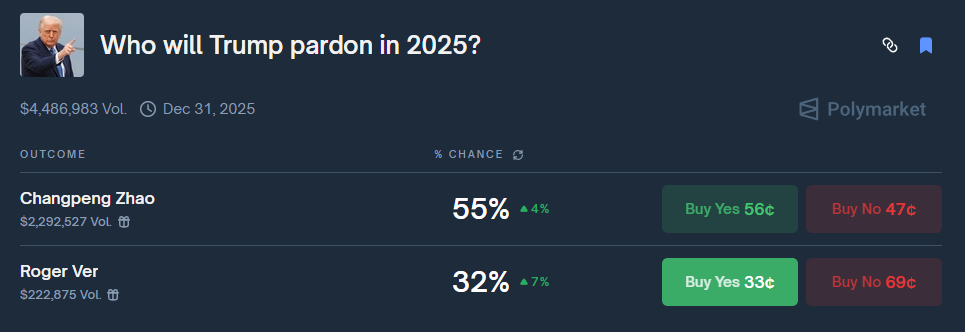 Home News The probability on Polymarket of “CZ receiving a Trump pardon this year” has risen to 55%.