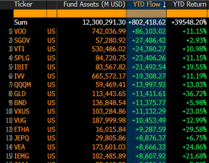 According to the data released by Eric Balchunas, the ETF with the highest inflow of funds this year is Vanguard’s S&P 500 ETF—VOO, with a net inflow of $86.1 billion. BlackRock’s IBIT ranks 5th, with a net inflow of $21.49 billion year-to-date; BlackRock’s ETHA ranks 12th, with a net inflow of $9.287 billion year-to-date.
