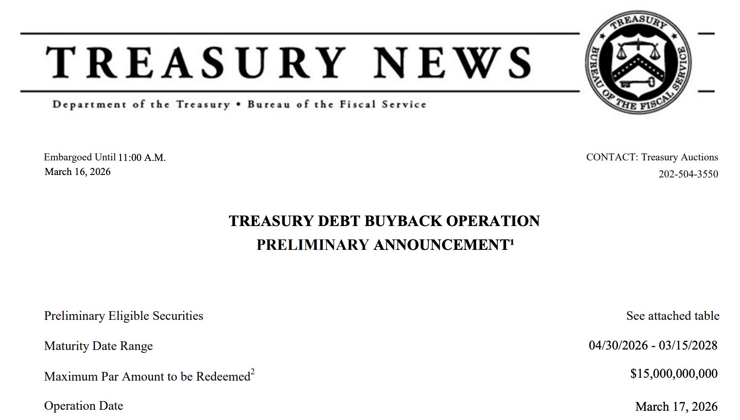 BlockBeats News, March 17th, according to Barchart, the US Treasury is expected to repurchase $15 billion of domestic government debt today, exceeding last week’s $14.7 billion, making it the largest buyback in history.