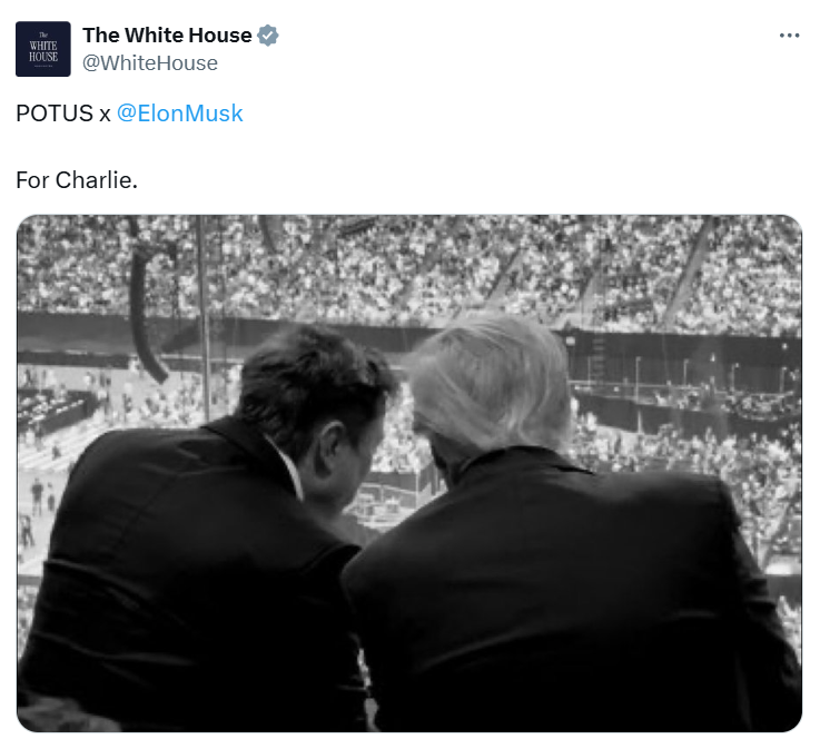BlockBeats News, September 22, the White House in the United States displayed a photo of Trump and Musk together on the X platform, with the caption “For Charlie”.