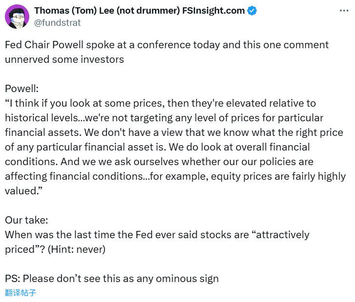BlockBeats News, September 24th – In response to Federal Reserve Chairman Powell’s comment this morning that “current stock prices are quite high,” BitMine Board Chairman Tom Lee stated that the Fed will never say that stock prices are “attractive.” Therefore, please do not consider this as a bad omen.