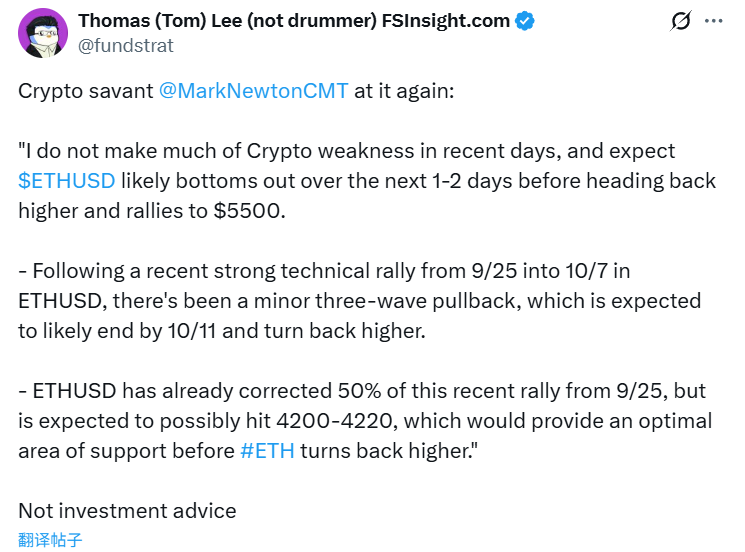 BlockBeats News, October 10, this morning, Tom Lee retweeted his fund analyst Mark Newton’s latest view on Ethereum. Mark Newton believes that the recent pullback in the crypto market in the past few days is not to be feared, expecting Ethereum to bottom out in the next 1-2 days, then rise again and rebound to $5500. From September 25 to October 7, ETH experienced a strong technical uptrend, followed by only a slight three-wave correction, expected to end the adjustment and resume the uptrend by October 11.