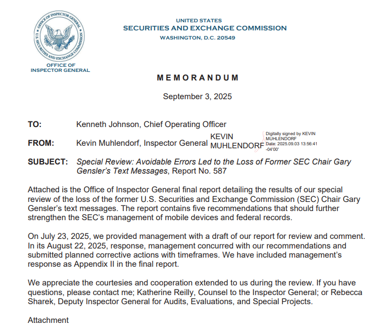 BlockBeats News, September 5th. According to a recent SEC report, due to a series of “avoidable” technical failures in the agency’s Information Technology Office, former Chair Gary Gensler’s one-year worth of text messages have been permanently lost.