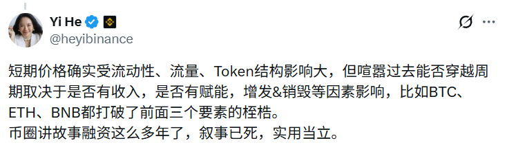BlockBeats News, February 15th. Regarding the statement made by the so-called “Chase, Former Listing Manager of Binance,” in an interview mentioning that “short-term price is influenced by liquidity, attention, and tokenomics,” He Yi stated, “Indeed, short-term price is greatly influenced by liquidity, traffic, and token structure. However, whether the hype can transcend the cycle depends on whether there is revenue, empowerment, impact of issuance and burn, etc. For example, BTC, ETH, and BNB have all broken free from the constraints of the first three elements. The crypto industry has been storytelling for so many years, the narrative is dead, utility is now key.”