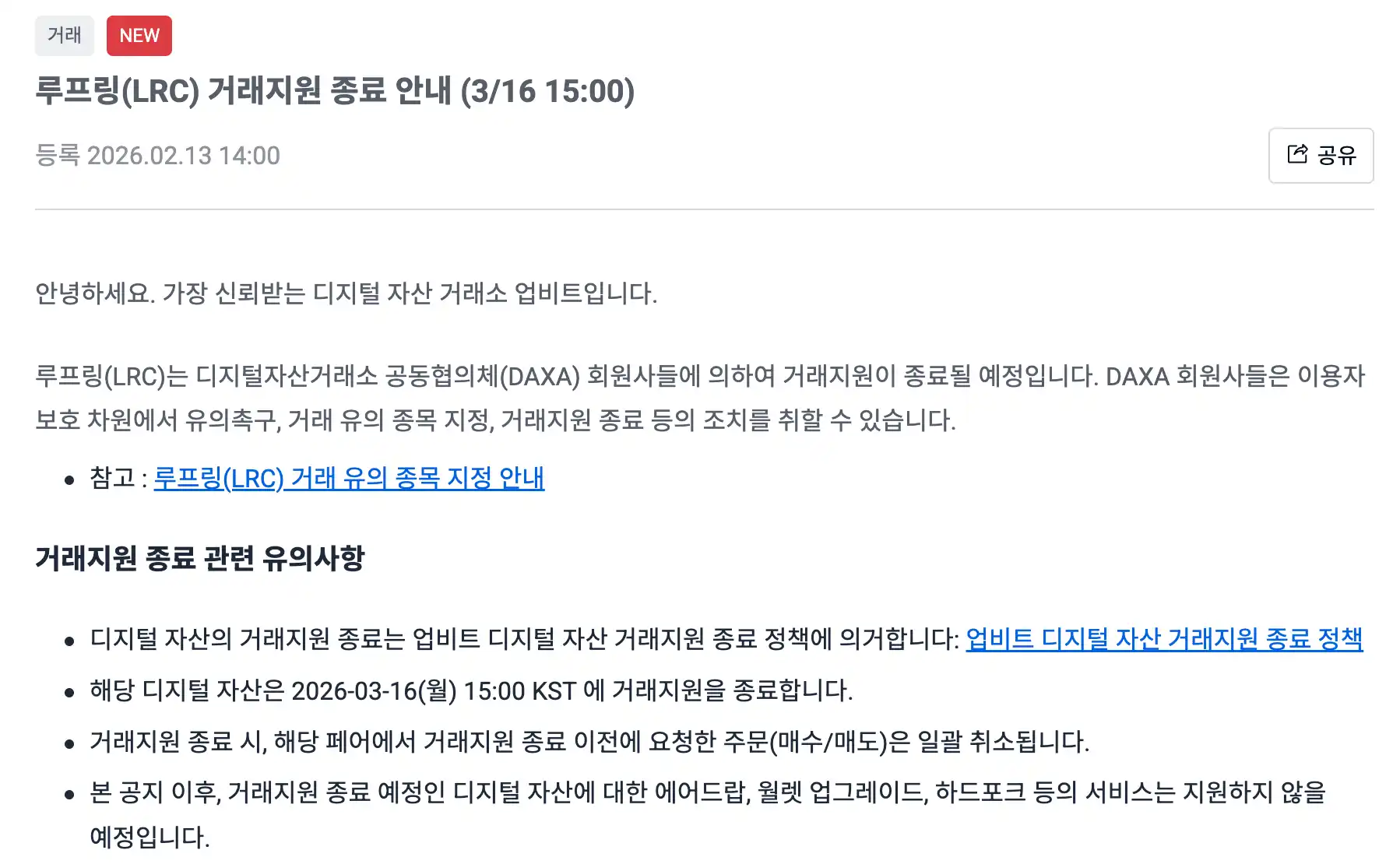 BlockBeats News, February 13th, according to an official announcement, Upbit announced that it will delist Loopring (LRC) spot trading on March 16th.