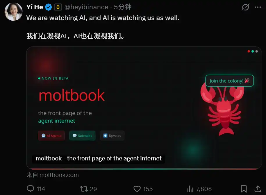BlockBeats News, January 31, Binance CEO Changpeng Zhao (CZ) tweeted about the AI-based social network Moltbook, stating, “As we gaze at AI, AI also gazes back at us.”