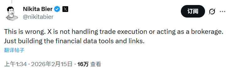 BlockBeats News, February 15th, regarding the community-discussed topic of “X Platform Will Allow Users to Directly Trade Stocks and Cryptocurrencies Based on Timeline,” X Product Lead and Solana advisor Nikita Bier further stated that X will not handle trade execution or act as a broker; it is merely building financial data tools and connections.