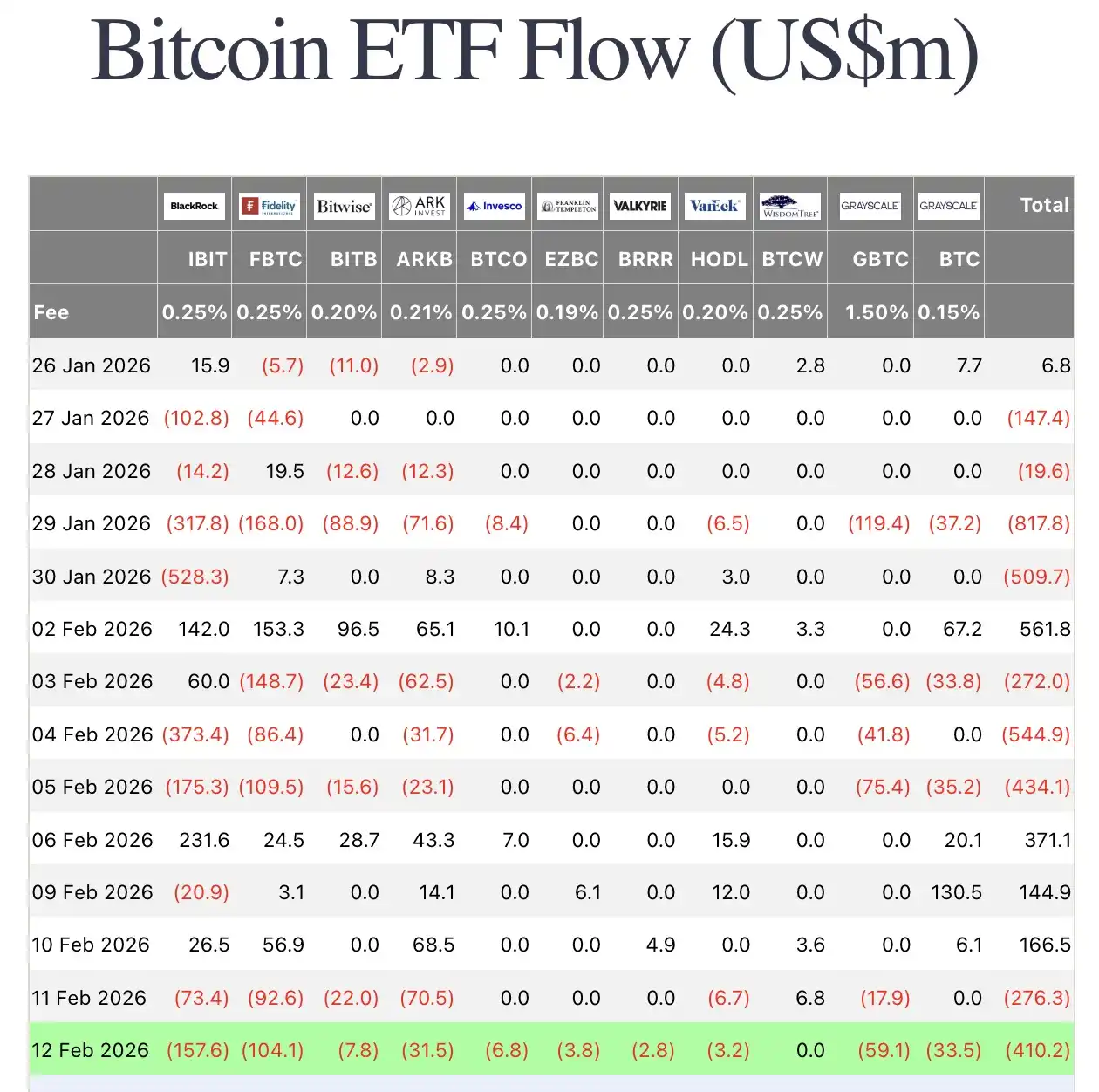BlockBeats News, February 13, according to Farside Investors monitoring, yesterday the net outflow of the US spot Bitcoin ETF was $410.2 million, marking a large net outflow for the second consecutive day.