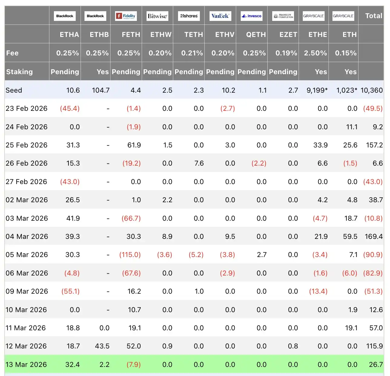 BlockBeats News, March 14, according to Farside data, yesterday’s net inflow of $26.7 million was observed in the US Ethereum spot ETF, marking the fourth consecutive day of net inflows.