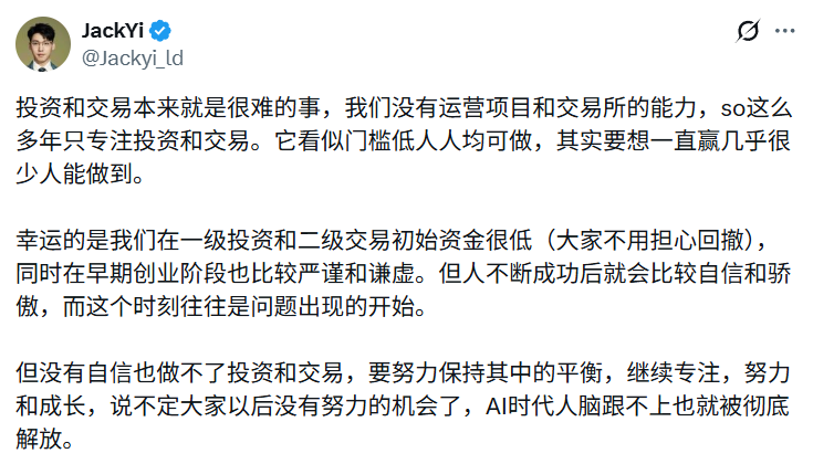 But without confidence, one cannot engage in investment and trading. One must strive to maintain a balance, stay focused, work hard, and grow. Perhaps in the future, there will be no opportunity for hard work anymore, and in the AI era, when the human brain can’t keep up, it will be completely liberated.”