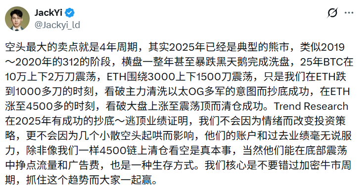 BlockBeats News, January 29, Liquid Capital (formerly LD Capital) founder Li Hua published a post stating that some short sellers consider the “four-year cycle” as their main logic, believing that 2025 has entered a bear market phase similar to 2019-2020, and the market may trade sideways for a long period or even undergo a washout through extreme volatility. He pointed out that Trend Research had previously completed its position accumulation during the Ethereum lows phase and liquidation during the highs consolidation phase, and such operations have been verified on-chain.